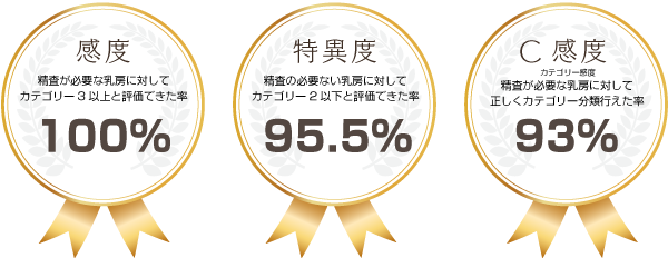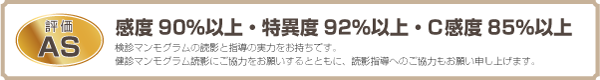 ※ マンモグラフィ読影試験マンモグラフィ読影技術の水準を保つことを目的とした試験です。マンモグラフィ100例を読影し感度(精査が必要な乳房をきちんと評価できたか)、特異度(精査の必要ない乳房をきちんと評価できたか)、C感度(精査が必要な乳房に対して正しくカテゴリ分類が行えた率)の3つの評価が80%以上で合格となる試験です。マンモグラフィ読影試験において最上級の評価AS(指導者資格)の評価を取得しました。